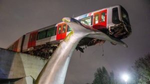 TREM DESCARRILA, MAS É SALVO POR OBRA DE ARTE GIGANTE