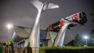 Em vez de cair de uma altura de 10 metros após sair dos trilhos, o trem foi “agarrado” por uma grande escultura curiosamente intitulada “Salvo pela cauda de uma baleia”.