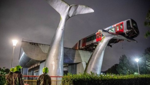 Em vez de cair de uma altura de 10 metros após sair dos trilhos, o trem foi “agarrado” por uma grande escultura curiosamente intitulada “Salvo pela cauda de uma baleia”.