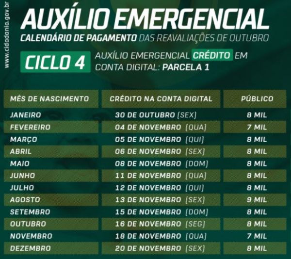 Os pagamentos do Ciclo 4, a 7ª parcela para alguns brasileiros, começou dia 30 de outubro. Na data, os beneficiários nascidos em janeiro receberam o valor de R$ 300 para movimentação na conta digital da Caixa. Os próximos depósitos serão feitos na quarta-feira (11) e quinta-feira (12) e sexta-feira (13).