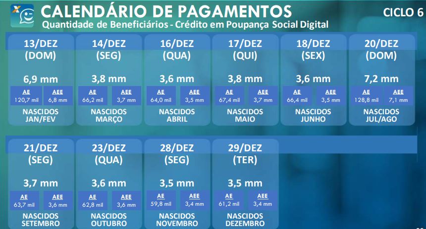 O último calendário previsto pela Caixa, denominado Ciclo 6, terá início no dia 13 de dezembro. Na data, tanto os nascidos em janeiro como em fevereiro terão acesso ao auxílio emergencial.