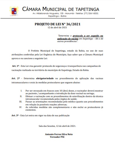Leia na íntegra o Projeto de Lei nº 36/2021 aprovado no último dia 15 de abril de 2021 pela Câmara Municipal de Itapetinga: