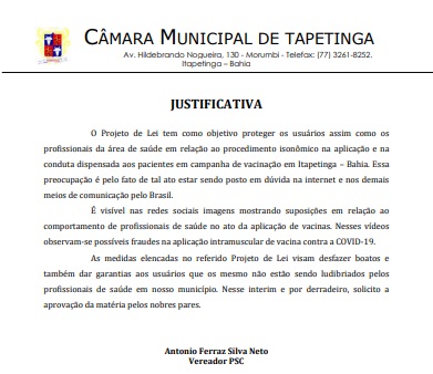 O autor do Projeto, nos afirma que “esta lei tem como intuito, garantir segurança e transparência nas campanha de vacinação no município de Itapetinga. A pessoa que está sendo vacinada precisa ter a garantia de que está sendo vacinada. O vacinador terá que mostrar a seringa com o líquido e, após a aplicação, mostrar a seringa já sem conteúdo.”