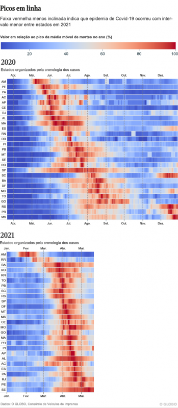 Em 2021, em 24 estados brasileiros, a pandemia da Covid-19 tem seu ciclo de auge nos óbitos concentrado ao longo de um mês e meio, no outono. Em comparação ao ano passado, quando os picos ocorreram ao longo de quatro meses e meio, há uma temporada de alta mais bem delineada, semelhante à curva da gripe.