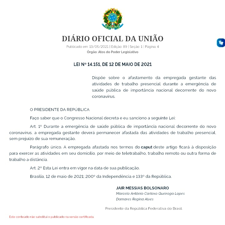 Segue Lei Federal nº 14.151 do dia 12 de maio de 2021 onde dispõe sobre o afastamento da empregada gestante das atividades de trabalho presencial durante a emergência de saúde pública de importância nacional decorrente do novo Coronavírus.