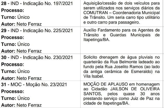 Na ocasião foram aprovadas c⁷erca de 40 proposições. Entre elas, 03 indicações e 01 monção de aplausos do Vereador Neto Ferraz (PSC). Todas aprovadas por unanimidade.