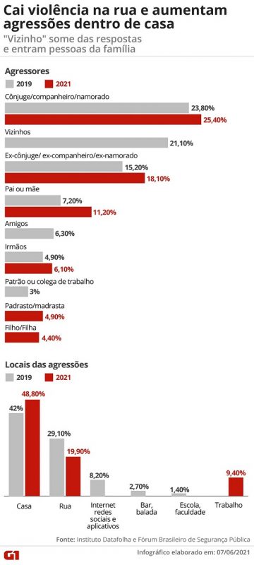 Em 2021, o “vizinho”, que em 2019 ficou em segundo lugar como autor das agressões (21%), neste ano sumiu das respostas. Em seu lugar apareceram o pai, a mãe, irmão, irmã, padrasto, madrasta, o filho e a filha.