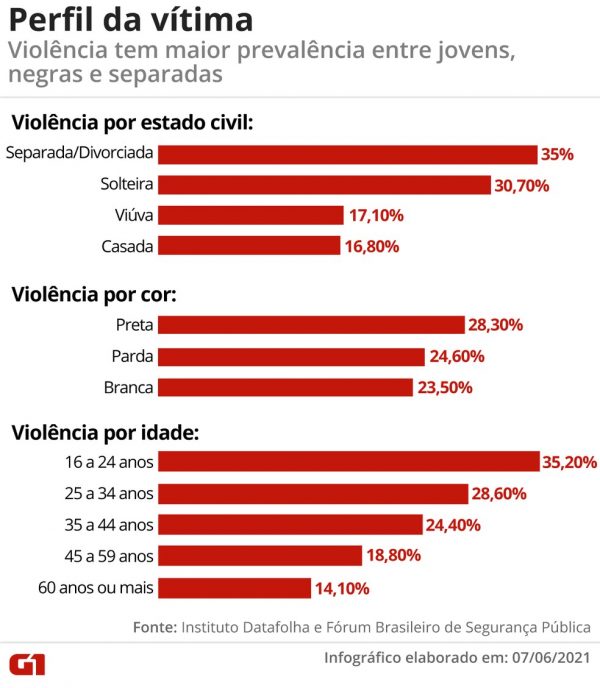 Isso significa que cerca de 17 milhões de mulheres (24,4%) sofreram violência física, psicológica ou sexual no último ano. A porcentagem representa estabilidade em relação à última pesquisa, de 2019, quando 27,4% afirmaram ter sofrido alguma agressão.