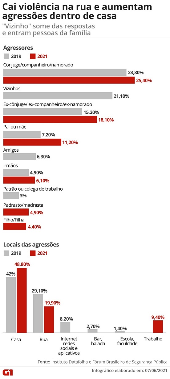 Em 2021, o “vizinho”, que em 2019 ficou em segundo lugar como autor das agressões (21%), neste ano sumiu das respostas. Em seu lugar apareceram o pai, a mãe, irmão, irmã, padrasto, madrasta, o filho e a filha.