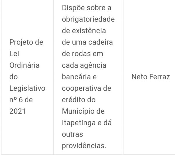 Através do Projeto de Lei Ordinária n° 6/2021, as Agência Bancárias e Cooperativas de Crédito do município de Itapetinga serão obrigadas a disponibilizar cadeiras de rodas para que a pessoa com deficiência possa se locomover dentro do estabelecimento.