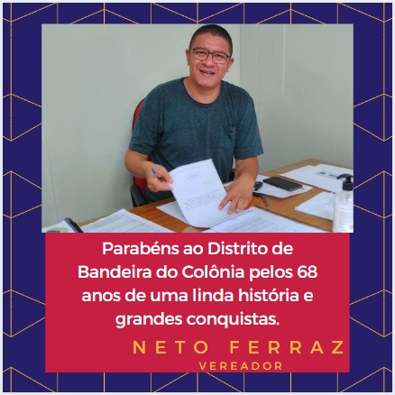 O Vereador do PSC, Neto Ferraz, parabeniza ao Distrito de Bandeira de Colônia pelos 68 anos de uma linda história e grandes conquistas.