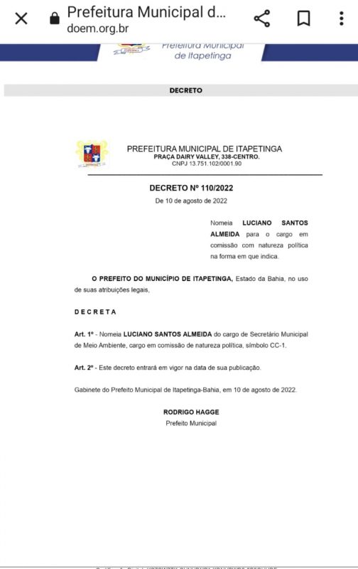 Foi publicado no Diário Oficial do Município no dia de hoje, 10/08, a nomeado de Luciano Santos Almeida como novo Secretário de Meio Ambiente do município.