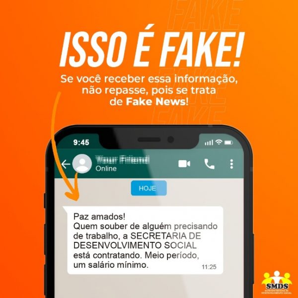 Os criminosos da internet estão se aproveitando da necessidade da população para aplicarem novos golpes. Nos últimos dias, está circulando pelas redes sociais do município, uma notícia falsa, citando que a Secretaria Municipal de Desenvolvimento Social estaria contratando pessoas com um salário mínimo e jornada de meio período.