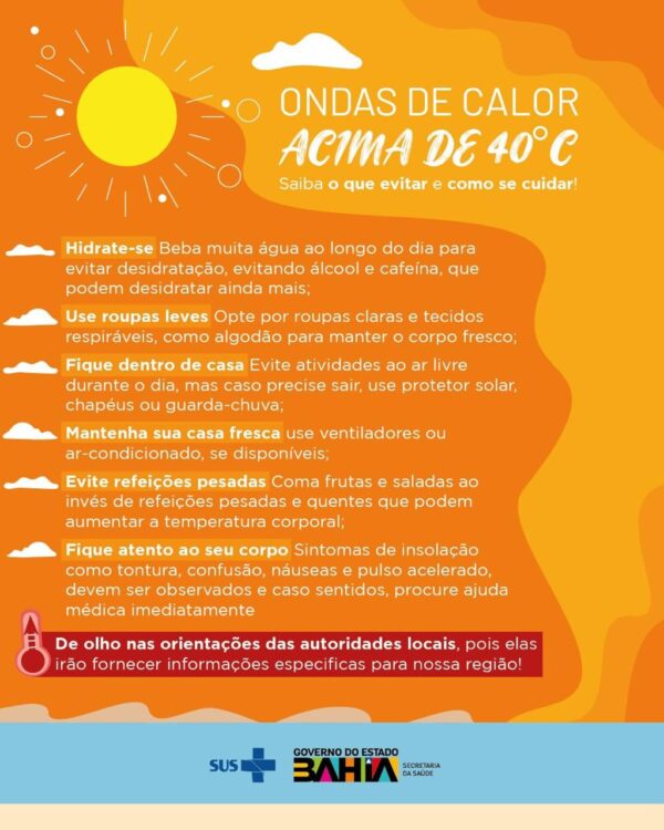 Um novo alerta do Instituto Nacional de Meteorologia (Inmet) inclui parte da Bahia em risco para a onda de calor que vem atingindo várias partes do Brasil essa semana. Segundo o aviso, o risco começou ontem pela manhã e deve durar de três a até cinco dias. No período, a temperatura deve ficar 5ºC acima da média histórica registrada.
