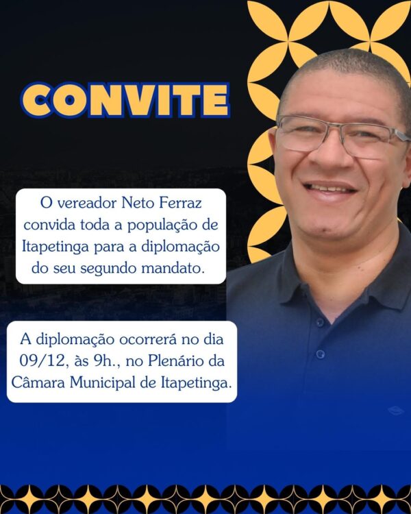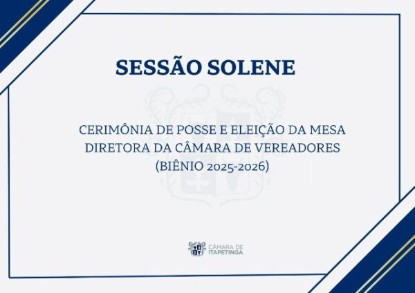A Câmara Municipal de Itapetinga-BA comunica que será realizada no dia 1º de janeiro, às 9h30, a Sessão Solene de Posse do prefeito, vice-prefeito e vereadores eleitos para o mandato 2025-2028. Na ocasião, também será realizada a Eleição da Mesa Diretora da Casa Legislativa (Biênio 2025-2026).