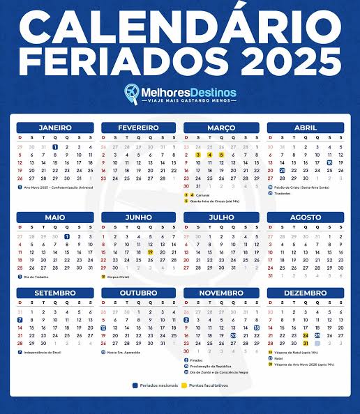O governo publicou uma portaria com a lista de feriados e dias de ponto facultativo em 2025. O calendário foi divulgado na edição desta segunda-feira (30) do Diário Oficial da União.