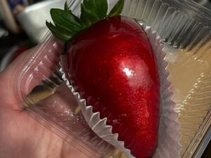 Textura sofisticada: morangos cobertos por brigadeiro de leite Ninho, envoltos em uma crosta crocante de caramelo vermelho brilhante formam uma combinação saborosa e gourmetizada.