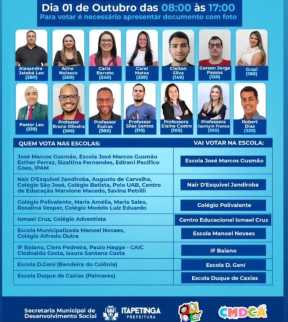 Serão escolhidos 2.225 membros para compor os 445 Conselhos Tutelares existentes em toda a Bahia. Cada conselho possui 5 membros titulares e os eleitos vão cumprir exercício no mandato de 2024 até 2027. A posse dos escolhidos está prevista para o dia 10 de janeiro do ano que vem.