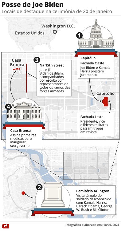 A posse de Joe Biden na presidência dos Estados Unidos nesta quarta-feira (20) tem um aparato de segurança sem precedentes, especialmente após o ataque ao Capitólio em 6 de janeiro, quando apoiadores de Donald Trump tentaram impedir a ratificação da vitória de Biden no Colégio Eleitoral.