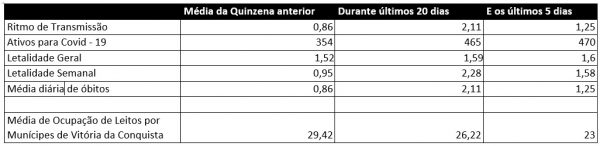 Ocupação de UTI – O relatório apresentado, omite a taxa geral de ocupação de leitos de UTI, atendo-se apenas a média de ocupação de leitos por moradores de Vitória da Conquista. Mesmo assim, no caso das UTI´s, os números demonstram que as medidas restritivas do governo da Bahia surtiram efeito, caindo a ocupação de UTI´s de 2,11 (taxa de 20 dias atrás), para 1,25, nos últimos 05 dias.